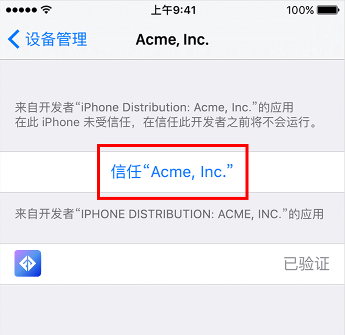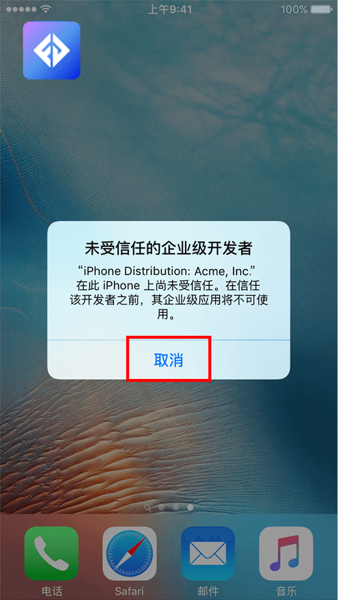 1、首次打開手動安裝的企業級應用時,會看到一個通知,提示該應用的開發者在設備上不受信任。您可以關閉此信息,但您無法打開該應用。