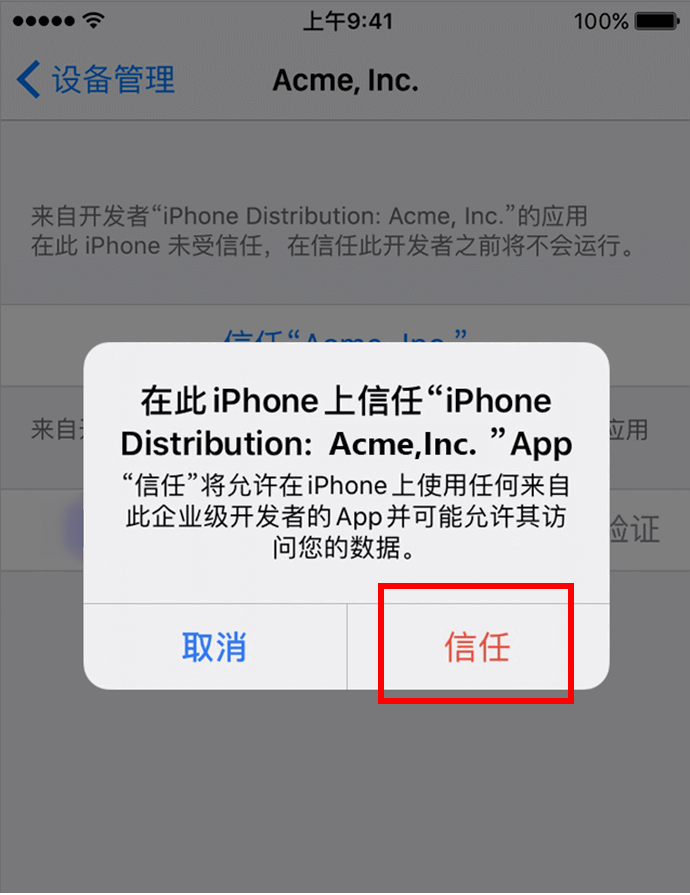 4、根據彈框提示信息,點擊”信任”。返回手機桌面,即可以正常訪問吾圈 App。